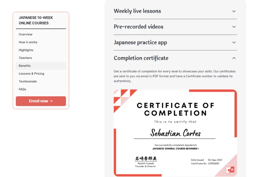 We’ve built what I like to call a "complete learning ecosystem." In addition to our live classes, you get a ton of resources to back you up. There's free access to our pre-recorded Japanese video courses and our practice app, which has drills for Hiragana and Katakana, flashcards for vocabulary, and even an AI teacher for conversation practice. You also get an official certificate of completion for every level you finish, sent as a PDF with a unique number for verification. It's not just a digital badge; it's something you can actually use to showcase your skills. And for a little fun, we've got our own entertaining and insightful Japanese language blogs, too.