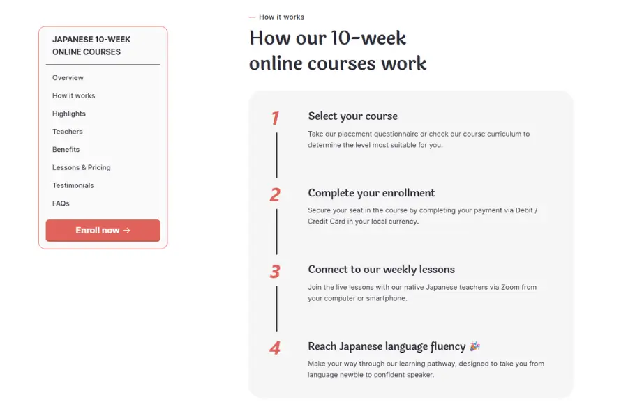 At Japademy, our main offering is the 10-Week Japanese Online Courses. These follow a clear structure with one 105-minute live class each week. These sessions happen via Zoom, allowing our students to learn directly from their teacher and interact with classmates who share their passion. Honestly, that community feeling is a huge motivator! Each of our courses has crystal-clear objectives, whether you’re a complete newbie or you've already got some Japanese under your belt.