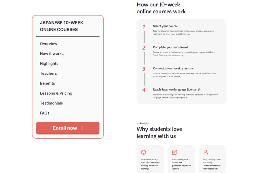 - Offers structured 10-week Japanese Online Courses, covering speaking, listening, reading, and writing
