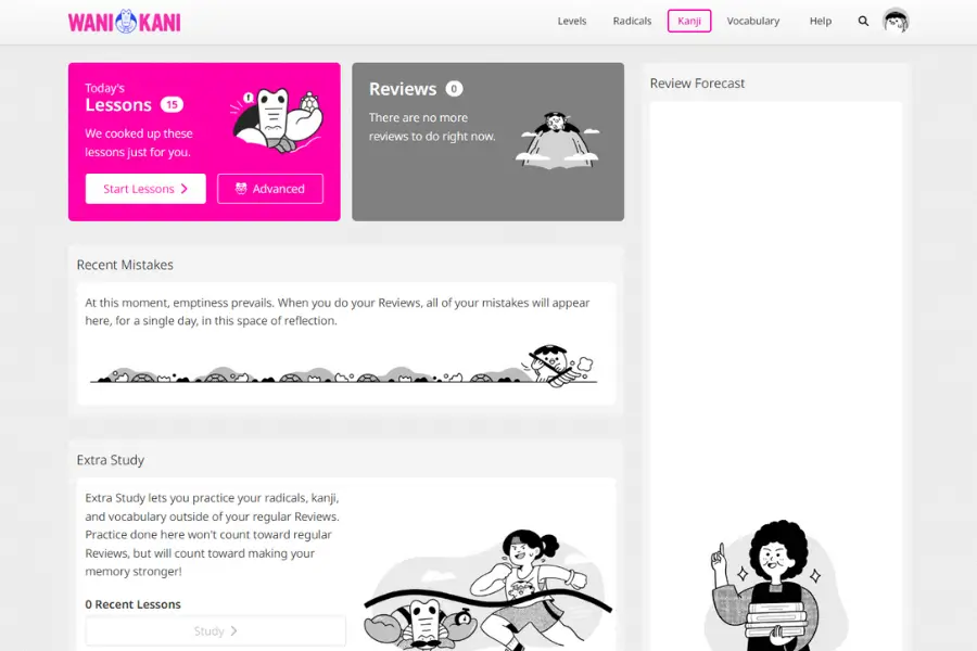 - Excellent spaced repetition system (SRS), gamifies kanji learning, and offers a handy "vacation mode".