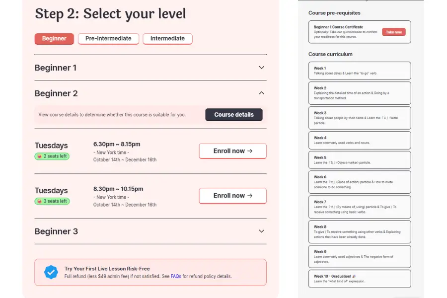 We operate on a different model entirely. Instead of a recurring subscription, you enroll in one of our 10-week courses, which cost $249 USD (or even less, at $229 USD, if you snag an early-bird discount). Yes, the initial, upfront cost is higher than WaniKani’s monthly fee, but our price is all-inclusive. It covers the live instruction with our native teachers, all lesson materials, the pre-recorded videos, and full access to our practice app. There are absolutely no hidden fees or extra textbook costs. Plus, for peace of mind, if you're not satisfied with the course, we offer a full refund (minus a small admin fee). Our pricing reflects a complete, guided program, not just one self-study tool.